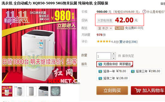 红网长沙12月18日讯(记者 吴庠)当标价42元一台的全自动洗衣机摆在面前,你会买吗?长沙网友高先生就毫不手软一口气买了5台——他在淘宝“天猫”商城仅花费210元,就“秒”得5台威力洗衣机,并第一时间完成了付款手续。