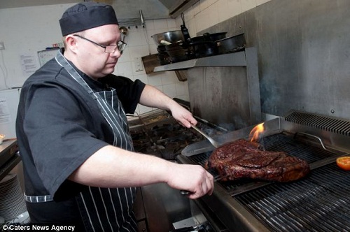据报道,普通的牛排每块大约0.4公斤,但这家餐馆推出的牛排却重达4公斤。“巨无霸”牛排长宽均为30厘米,有10厘米厚,厨师要花费整整2个小时才能把牛排烤到四五分熟。牛排还配有薯条、洋葱圈等配菜,每盘售价110英镑。能在1小时之内把牛排吃完的食客,都将获得餐厅的免单。
