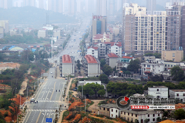 (4月9日,长沙茶子山路与银杉路交汇处附近,两栋房子挡住了主干道。图/潇湘晨报滚动新闻记者 华剑)