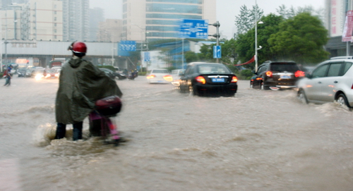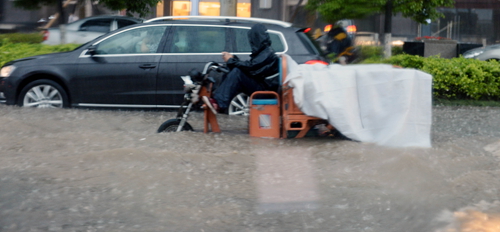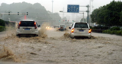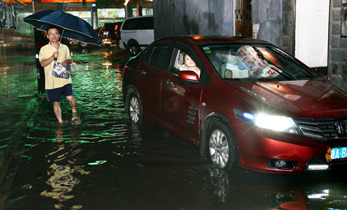 5月7日,长沙市福元西路与车站北路交界路口,路面积水很深,过往车辆如舟行。当天下午5时许,长沙地区突降暴雨,城区多处路段不同程度积水,给交通通行造成不便。本报记者 徐行 摄
