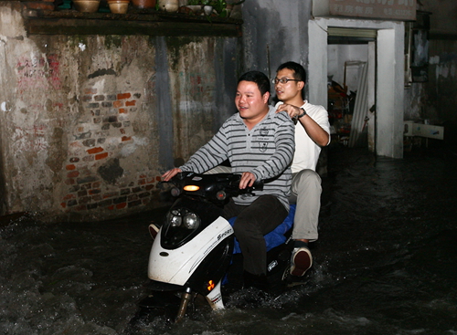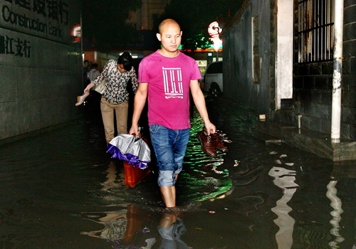 5月7日晚,长沙市湘春路段积水很深,市民涉水前行。当天下午,长沙市突降暴雨,城区多处出现严重内涝,部分地区交通瘫痪。本报记者 赵持 摄