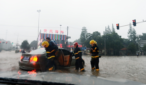 5月7日,长沙市福元西路与车站北路的路口,消防官兵将涉水熄火车内的乘客背出。当天下午5时许,长沙地区突降暴雨,城区多处路段不同程度积水,给交通通行造成不便。本报记者 徐行 摄