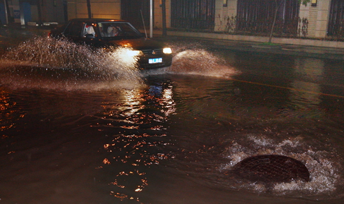 5月7日晚,长沙市湘春路上,多处井盖被大雨冲起,车辆在水中缓缓前行。当天下午,长沙市突降暴雨,城区多处出现严重内涝,部分地区交通瘫痪。本报记者 赵持 摄