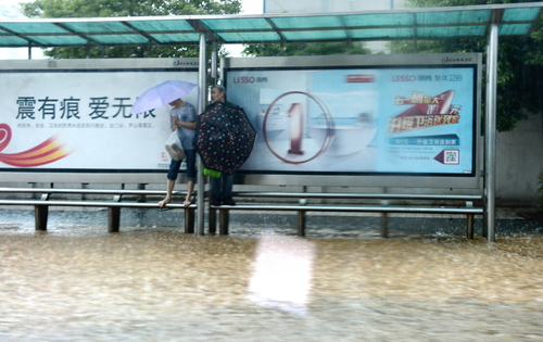 5月7日,长沙市福元西路,在公交站候车的乘客站在站棚坐凳上躲雨。当天下午5时许,长沙地区突降暴雨,城区多处路段不同程度积水,给交通通行造成不便。本报记者 徐行 摄