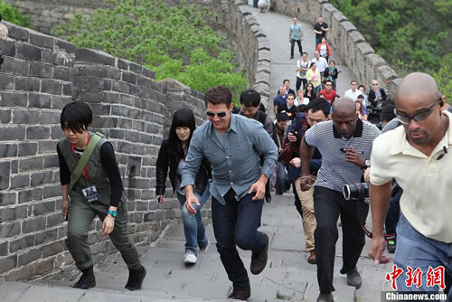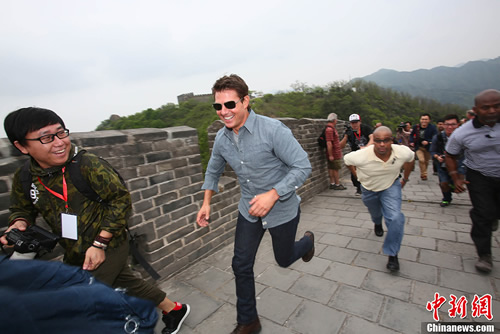5月9日,在北京宣传电影《遗落战境》的汤姆·克鲁斯开始他的第一次北京之旅,首站即是登长城当“好汉”,保镖护驾的阿汤哥兴致颇高,不仅跑步登长城与记者比快,还大秀亲和与在场几乎的所有游客合影。此外,阿汤哥对美食也颇感兴趣,自曝已经吃过烤鸭。而全程亲和的阿汤哥,还几次秀出不熟悉的中文,大声说“我爱北京”。图为汤姆·克鲁斯登上长城。中新社发 李学仕 摄
