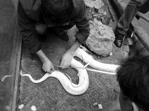 5月22日,快报曾报道“遛蛇哥”想打官司要回“小乖乖”。昨日,围绕黄金蟒“小乖乖”再起风波,先是约定好上午举行的专家鉴定因故终止。之后,又有传言称“小乖乖”已死掉,现在动物园内的那只黄金蟒是替代品。对此,动物园方面明确否认,并现场对黄金蟒进行了测量,确实比以前的身体短了12厘米。而媒体记者测量的结果更是短了82厘米。