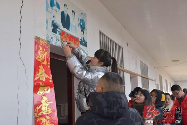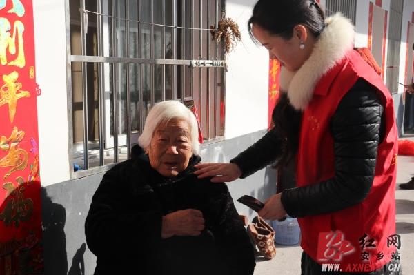 院子的一侧是老人们的房间,义工们分工协作,一人涂浆糊、一人贴对联,一人装红灯笼、一人找梯子,一人递胶带、一人贴窗花,一人从物资车上搬下给老人的礼物、一人忙接过送到老人房间,有条不紊、干劲十足;离灶房不远的临时大棚里,其他的义工正为中午的“团年饭”作准备;操坪其余的空地上,义工们支起三个炭火架,为大家烤糍粑,让饿了的人充充饥、冷了的人暖暖胃。还有另外一队义工,他们是此次活动派出的代表,专门前往离这里不远的安全乡敬老院,为住在那里的49位孤寡老人送去慰问品和新春祝福。