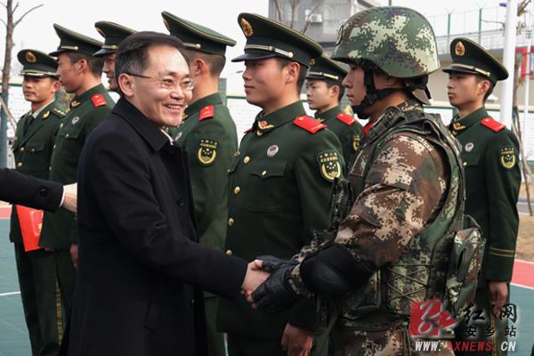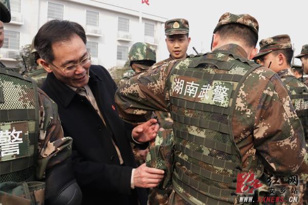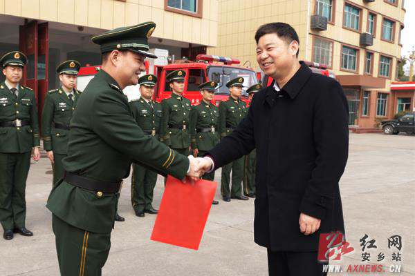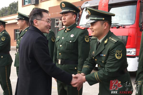 “值此新春佳节来临之际,我代表县委、人大、政府、政协、人武部和全县六十余万人民向官兵们长期以来为保护全县人民生命财产安全,维护我县社会和谐稳定,促进全县经济社会发展作出的积极贡献表示衷心感谢,祝大家在安乡过一个愉快的春节!”在县武警中队,张阳向全体官兵表达了诚挚问候和节日祝福,详细了解官兵设备配置情况。他希望,全体官兵要保持优良作风,加强训练,经常“亮剑”增强群众安全感,不辜负党和人民的重托,努力为全县社会治安稳定、经济发展做出新的更大的贡献。