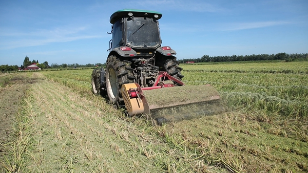 在大鲸港镇安庆村的水稻种植基地,灭茬机正在田间作业,将秸秆粉碎还田,紧随其后的旋耕机则对土壤与秸秆碎屑进行充分搅拌、破碎,实现一次性翻耕。该处理方式不仅有效减少了秸秆露天腐烂产生的异味,还加速了微生物分解过程,提高了土壤有机质含量,真正实现“秸秆变肥、沃土增收”。