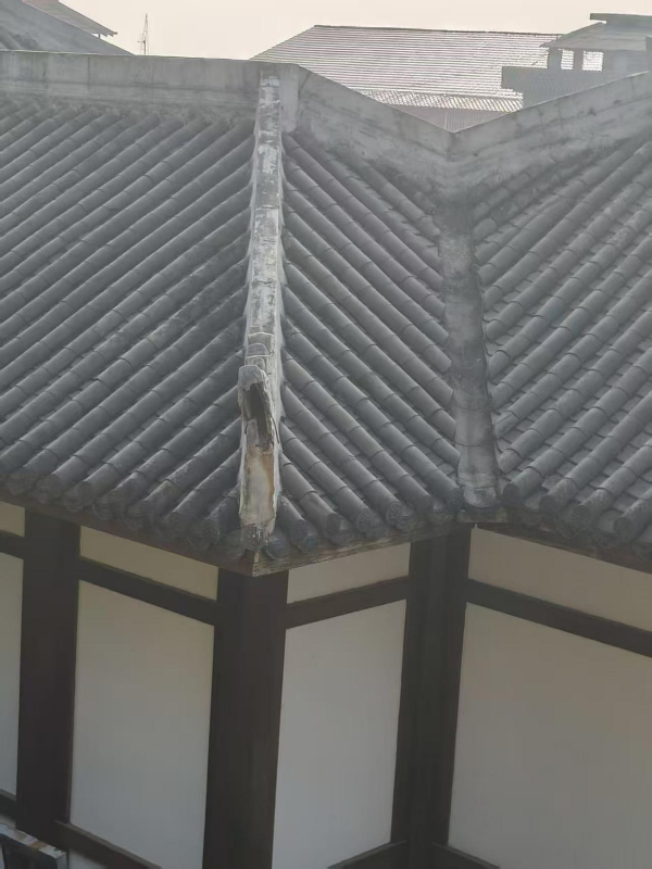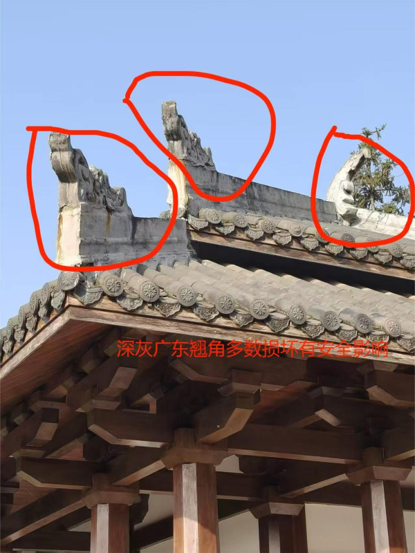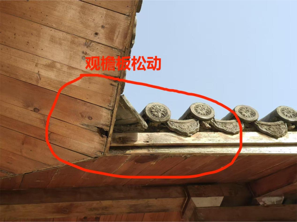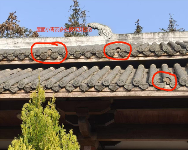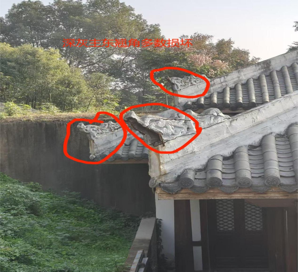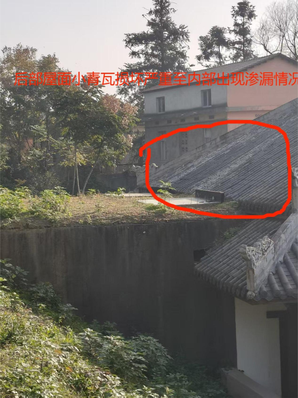 存在问题:1.后部屋面小青瓦损坏严重导致内部出现渗漏情况;2.屋面小青瓦多处松动损坏;3.入口处观瞻板多处松动;4.主屋东侧翘脚多数松动损坏;5.环廊垂脊损坏。