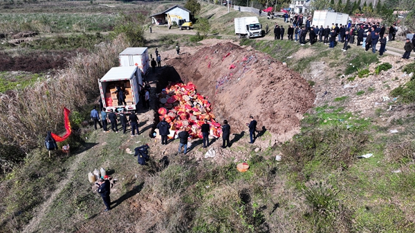 在销毁现场,执法人员将待销毁的非法烟花爆竹规范搬运至指定安全区域,采取焚烧后深埋的方式进行无害化处理。整个销毁过程严格遵循安全操作规程,确保销毁工作彻底、安全。行动结束后,消防人员对销毁区域实施了全覆盖喷水作业,有效降低现场温度,并细致清理了残留物,彻底消除复燃隐患,保障了周边环境安全。
