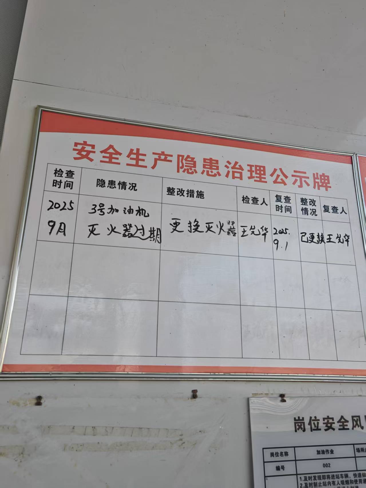 整改措施:督促其立即清理加油机附近及营业区域的可燃物、杂物,确保场地整洁畅通;严格按规定定期开展防火检查,及时更新完善检查记录;规范设置隐患治理公示牌,建立隐患自查自改常态化机制,明确整改责任人和时限,确保各类隐患闭环管理。